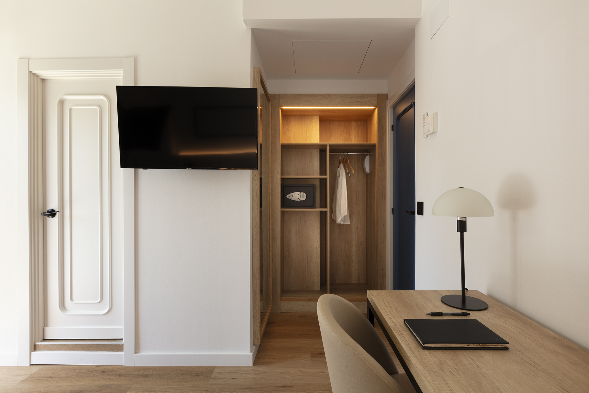 La chambre donne sur une terrasse extérieure aménagée pour profiter du climat méditerranéen.
